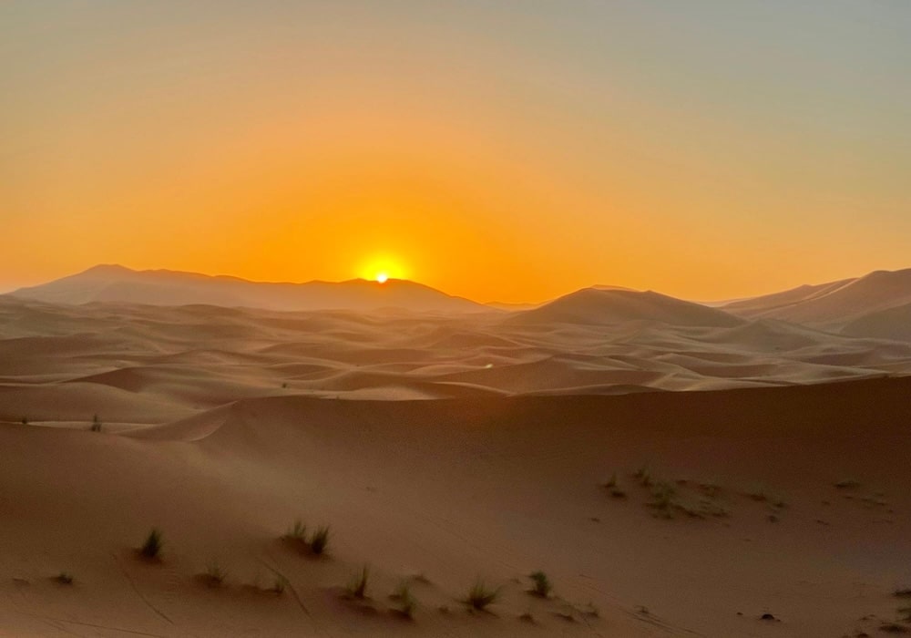 砂の中に埋もれるような小さな村ですが、サハラ砂漠に朝日が昇るのを観るのに最良のスポットです。鑑賞ポイントへは、ラクダに乗るか、歩いて行きます。