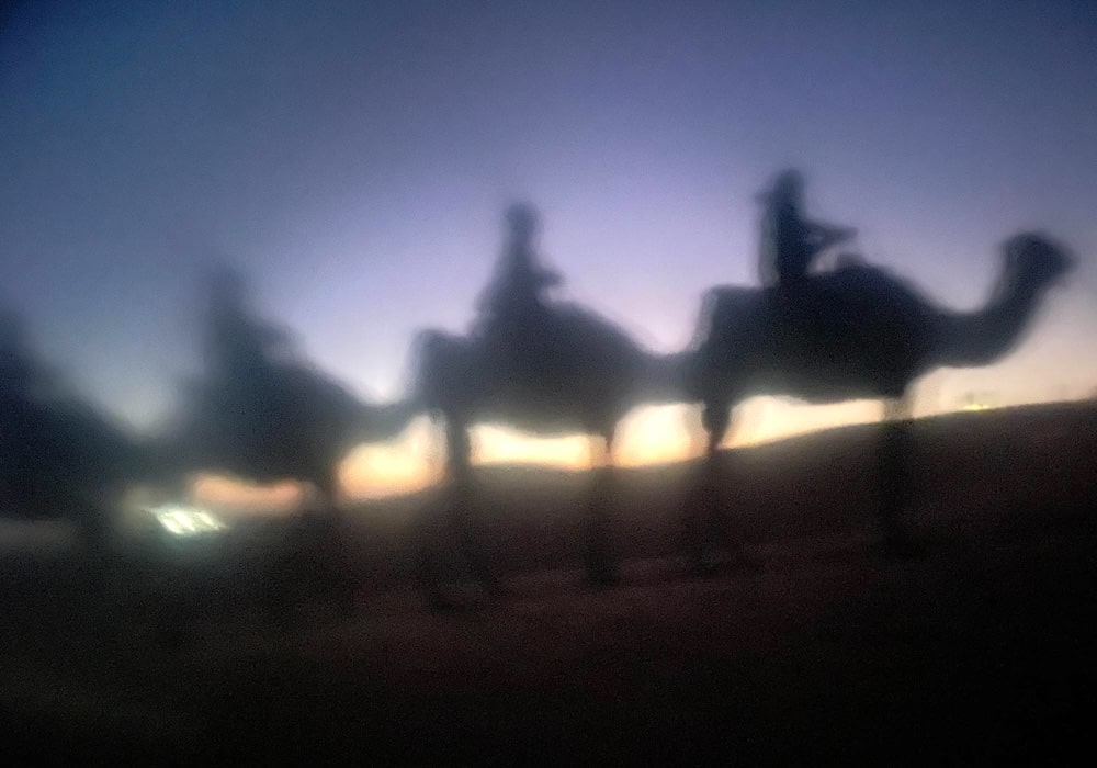 ラクダ使いのお兄さんに、スカーフの巻き方を習い、完全防備で暗闇を出発しました。