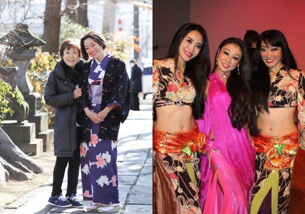 左:大好きな母との写真 右:ダンスに明け暮れていた頃。NYで活躍するベリーダンサーの友人達と